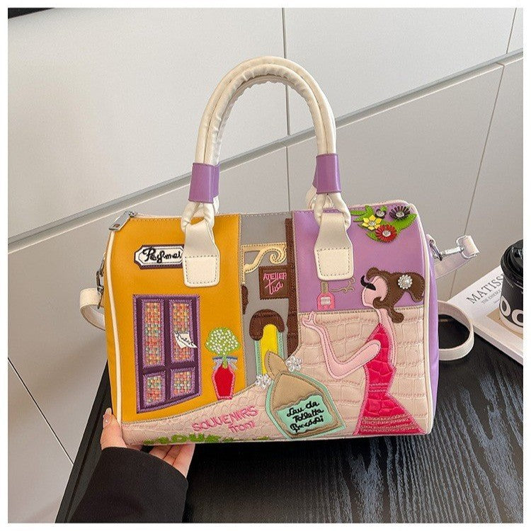 Retro Large Capacity Portable Boston Niche Embroidered Patch Crossbody Bags