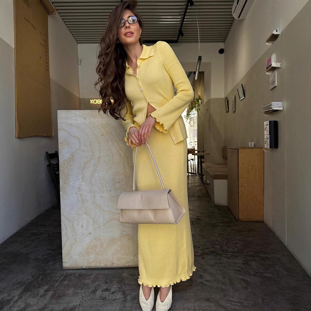 Women's Collar Long Sleeve Wooden Ear Knitted Suits